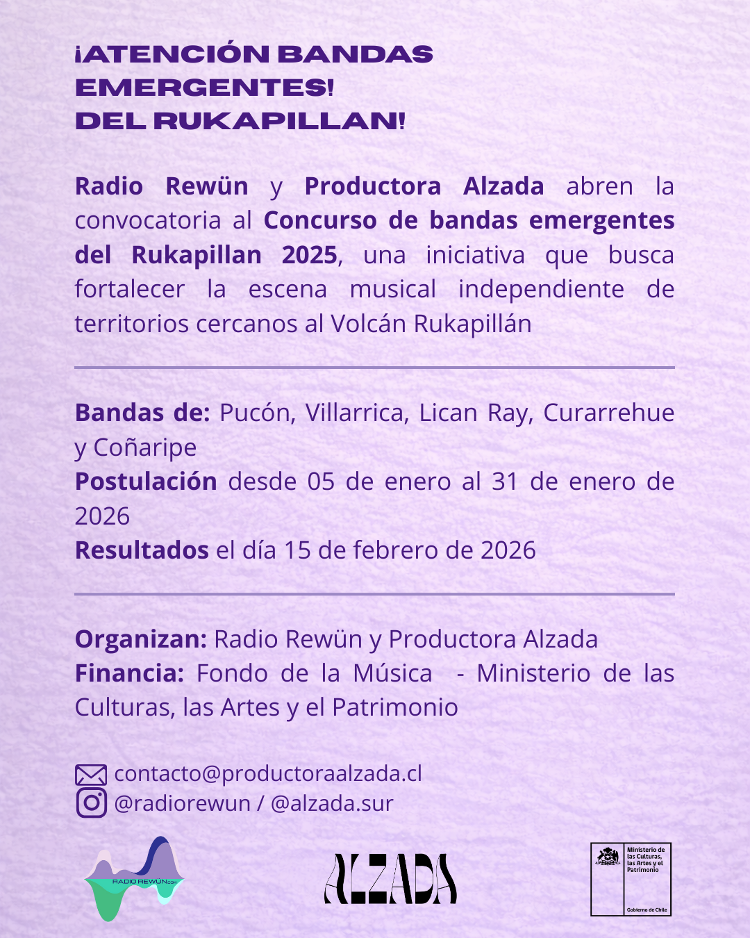 Bandas y proyectos musicales de cualquier estilo o género, conformadas por al menos dos músic@s, con residencia en las comunas cercanas al Volcán Rukapillan:
